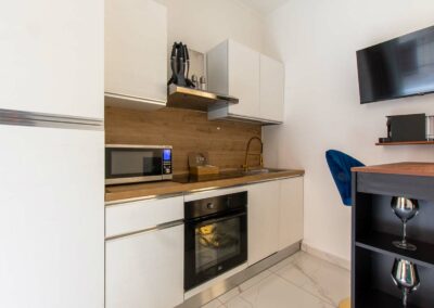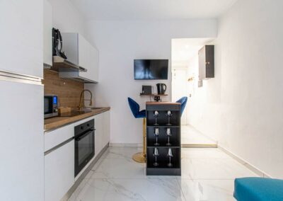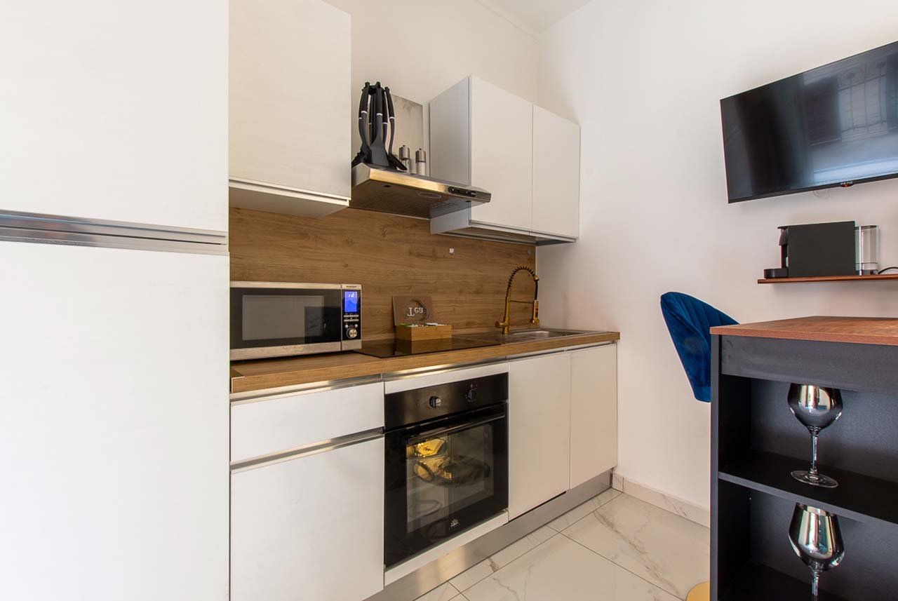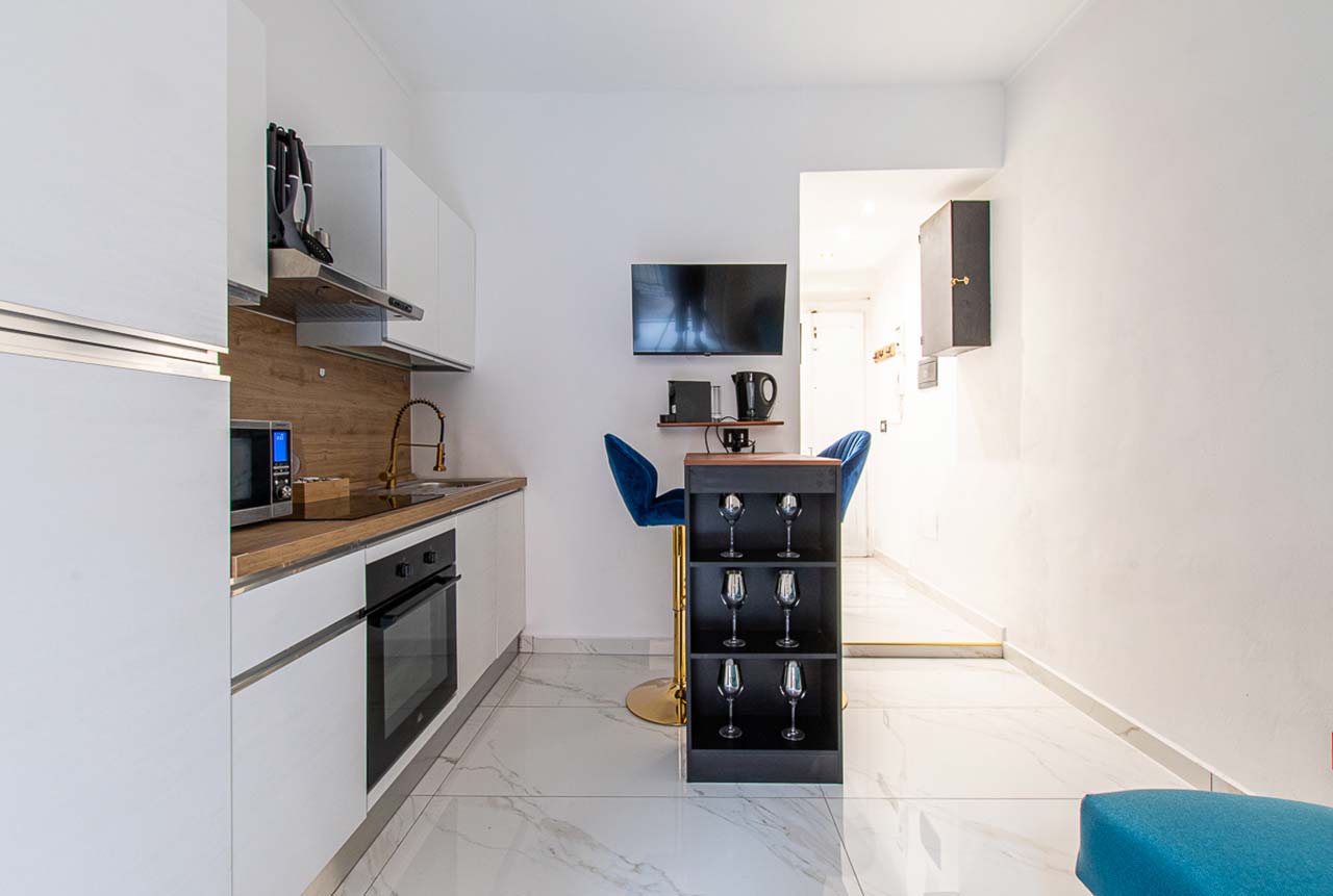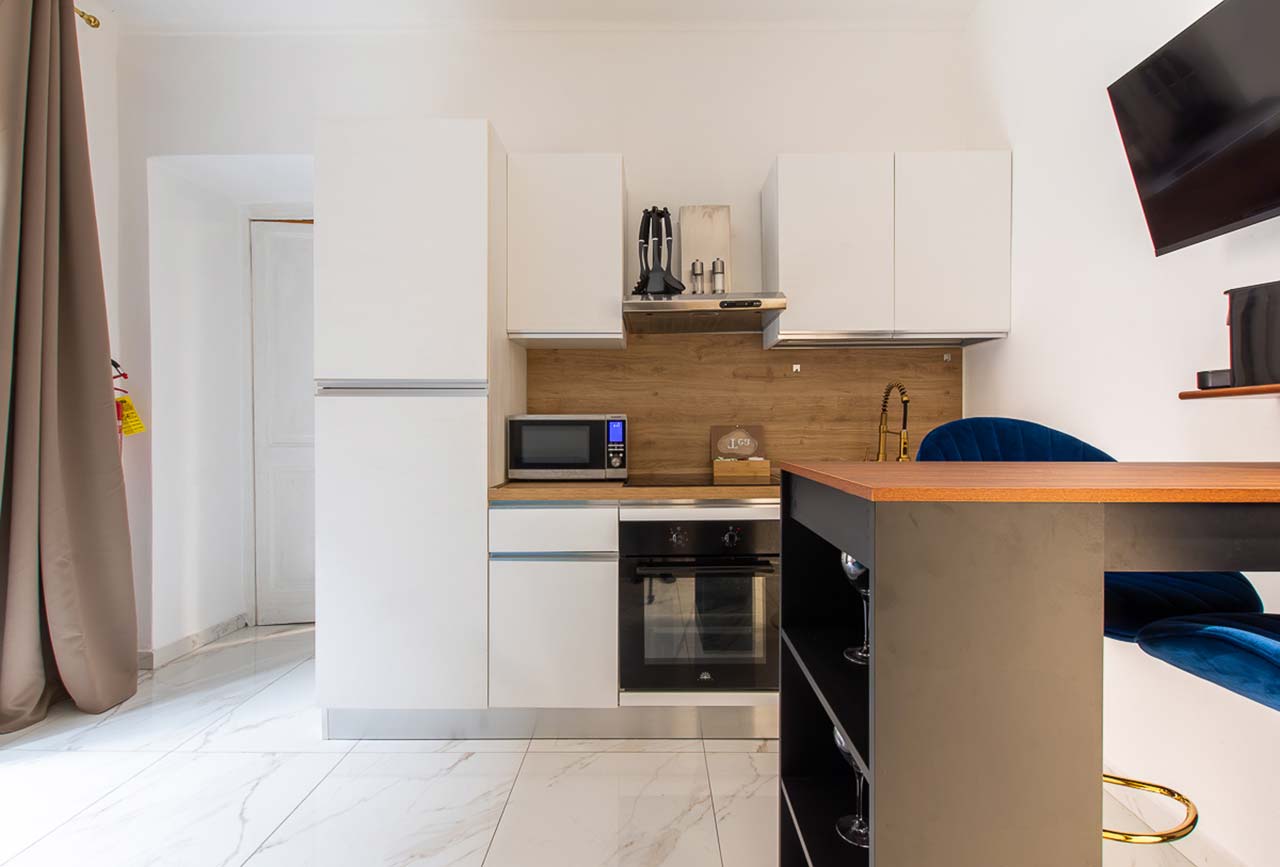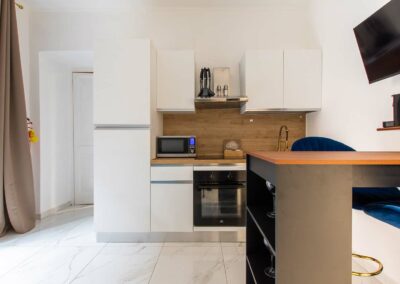 La zona living è luminosa e accogliente, arredata con gusto e dotata di un tavolo da pranzo, smart TV, aria condizionata e riscaldamento per ogni stagione. La cucina moderna è completamente attrezzata con piano cottura a induzione, forno tradizionale e microonde, frigorifero, freezer, lavastoviglie, macchina del caffè, bollitore e tutto il necessario per cucinare come a casa, inclusi piatti, posate e calici da vino.