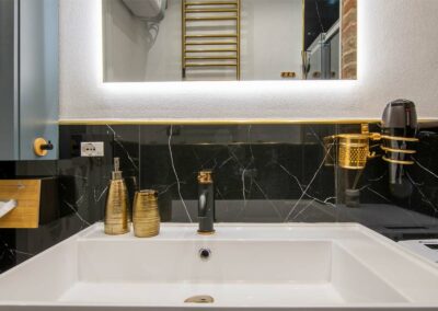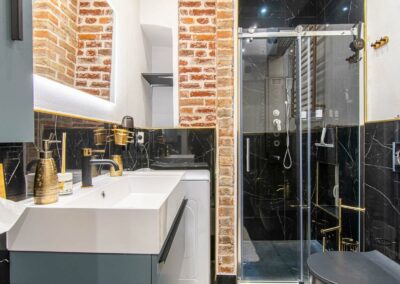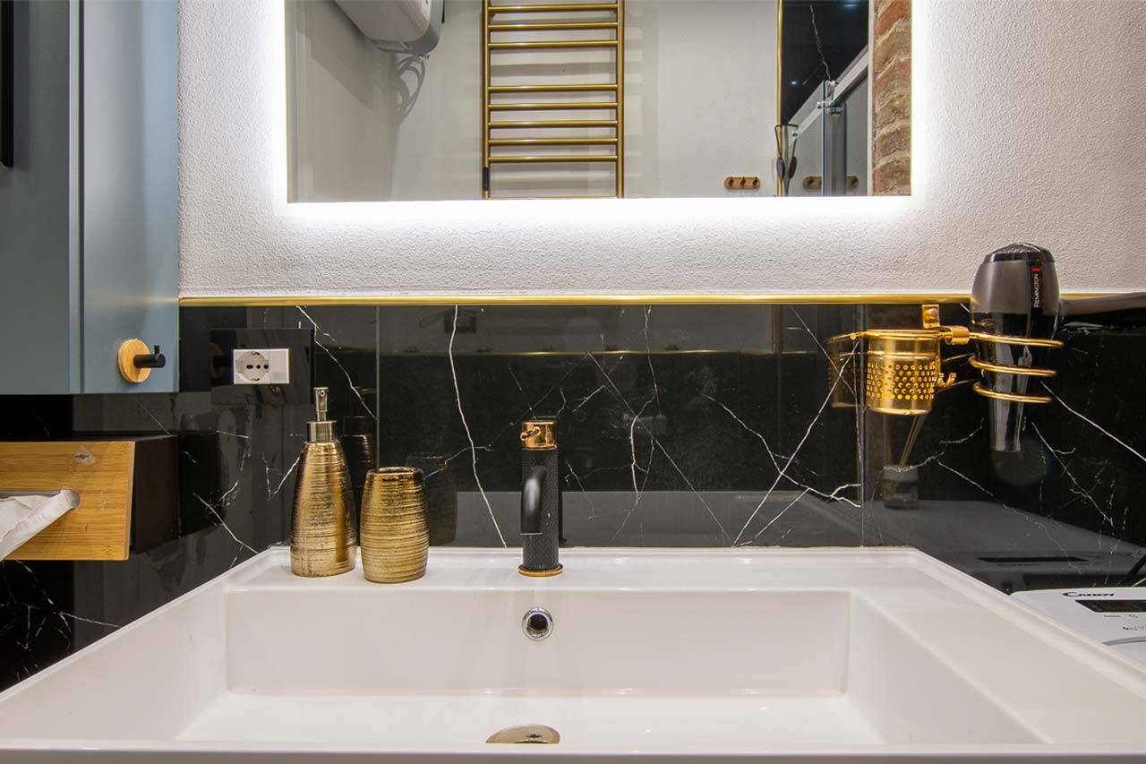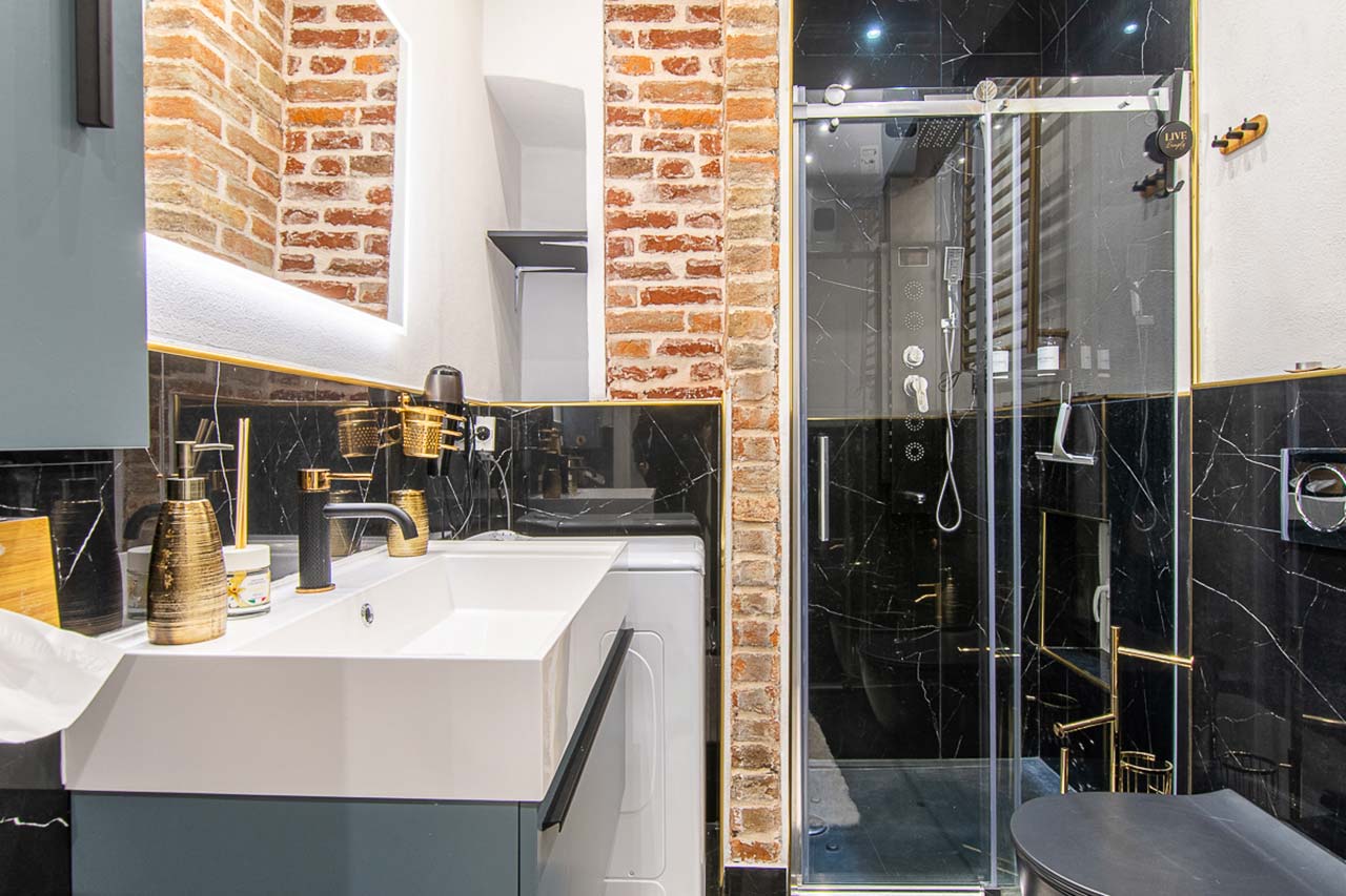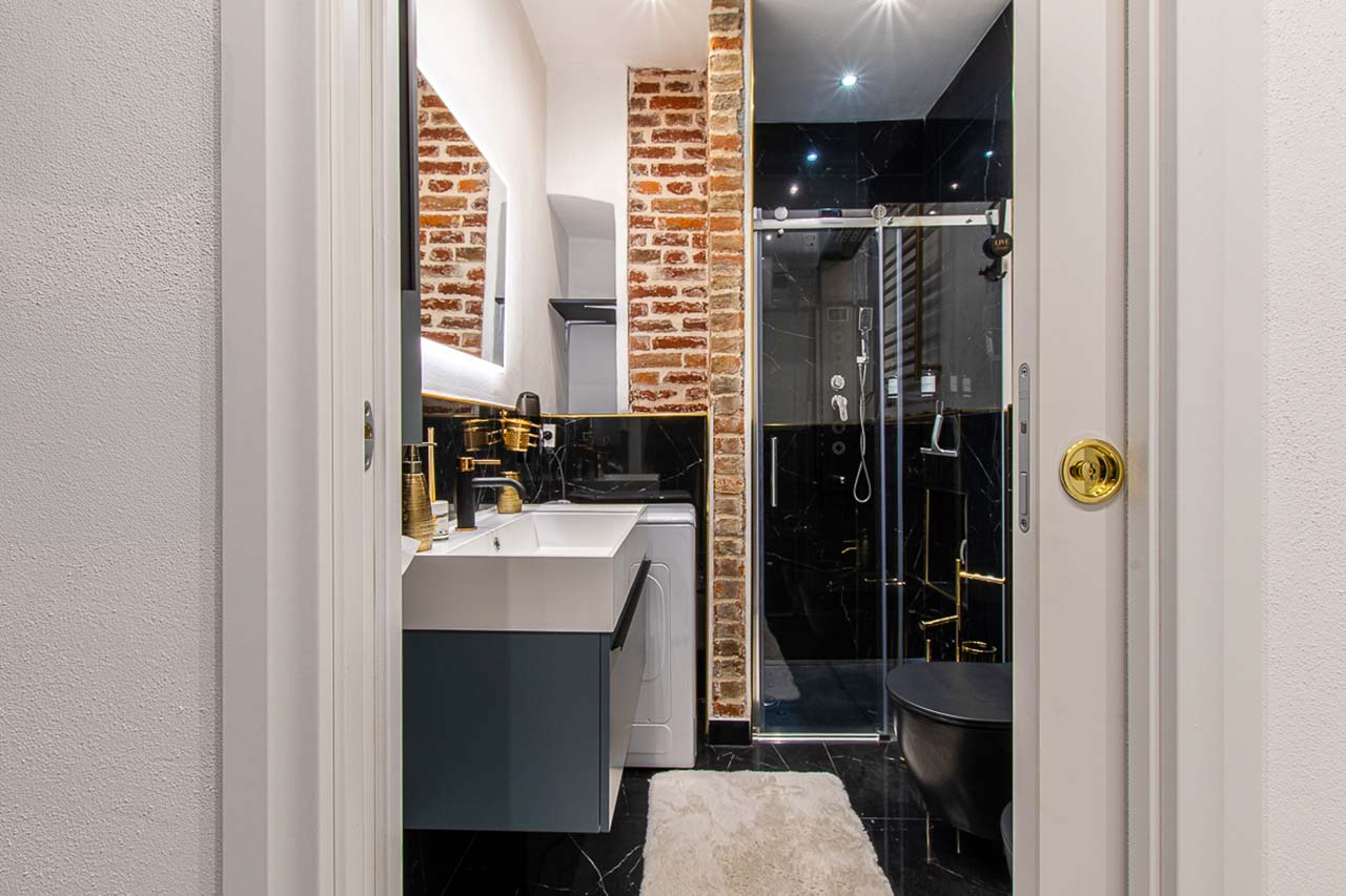 Il bagno è nuovo, moderno e funzionale, dotato di doccia, bidet, asciugacapelli, prodotti per l’igiene personale, carta igienica, riscaldamento intelligente e acqua calda sempre disponibile.