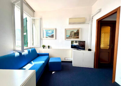 L’appartamento è pensato per offrire comfort e praticità in ogni dettaglio. Il salotto, luminoso e panoramico, dispone di un comodo divano, aria condizionata e smart TV con accesso a Netflix e Amazon Prime Video, ideale per rilassarsi dopo una giornata al mare. La cucina è attrezzata con piano cottura, frigorifero, macchina del caffè, bollitore e tutto il necessario per cucinare e gustare i pasti, da condividere nella zona pranzo con vista mare.